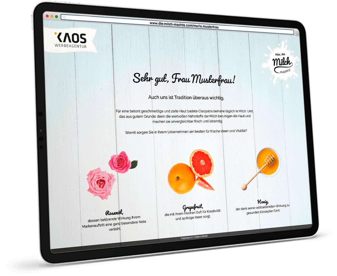 Sobald der Empfänger auf der personalisierten Landing Page ankommt, wird er erneut individuell angesprochen. Alle Inhalte – wie Bilder, Videos und Informationen, die seine Funktion im Unternehmen betreffen – können gezielt auf den jeweiligen potenziellen Kunden zugeschnitten werden. Der Empfänger ist überrascht und erfreut, seine „eigene Webseite“ vorzufinden, was die Aufmerksamkeit für Ihre Botschaft erheblich steigert. Diese individuelle Ansprache sorgt dafür, dass der Empfänger sich intensiver mit der Kampagne auseinandersetzt und nicht in der Masse untergeht.