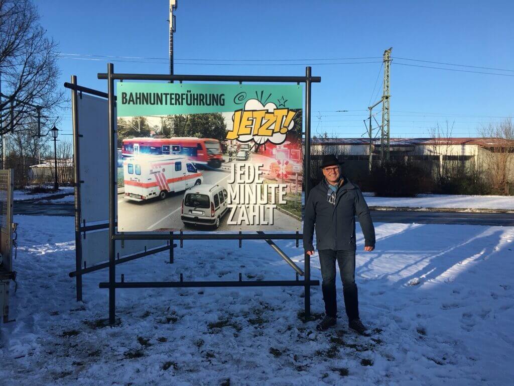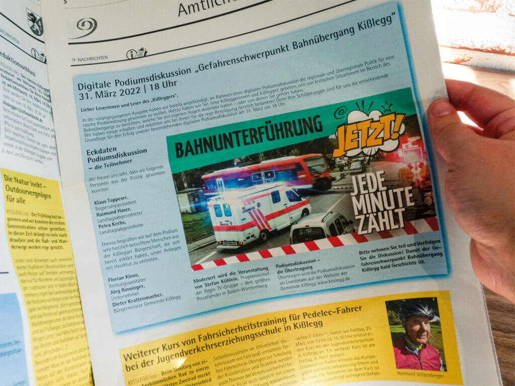 Hintergrund ist das traurige Alleinstellungsmerkmal Kißleggs, mit einer Straße durch den Bahnhofsbereich mit täglich 7.000 Fahrzeugen und der Problematik des Rettungsdienstes, der wegen der fehlender Alternativstrecke regelmäßig minutenlang vor geschlossenen Schranken steht.