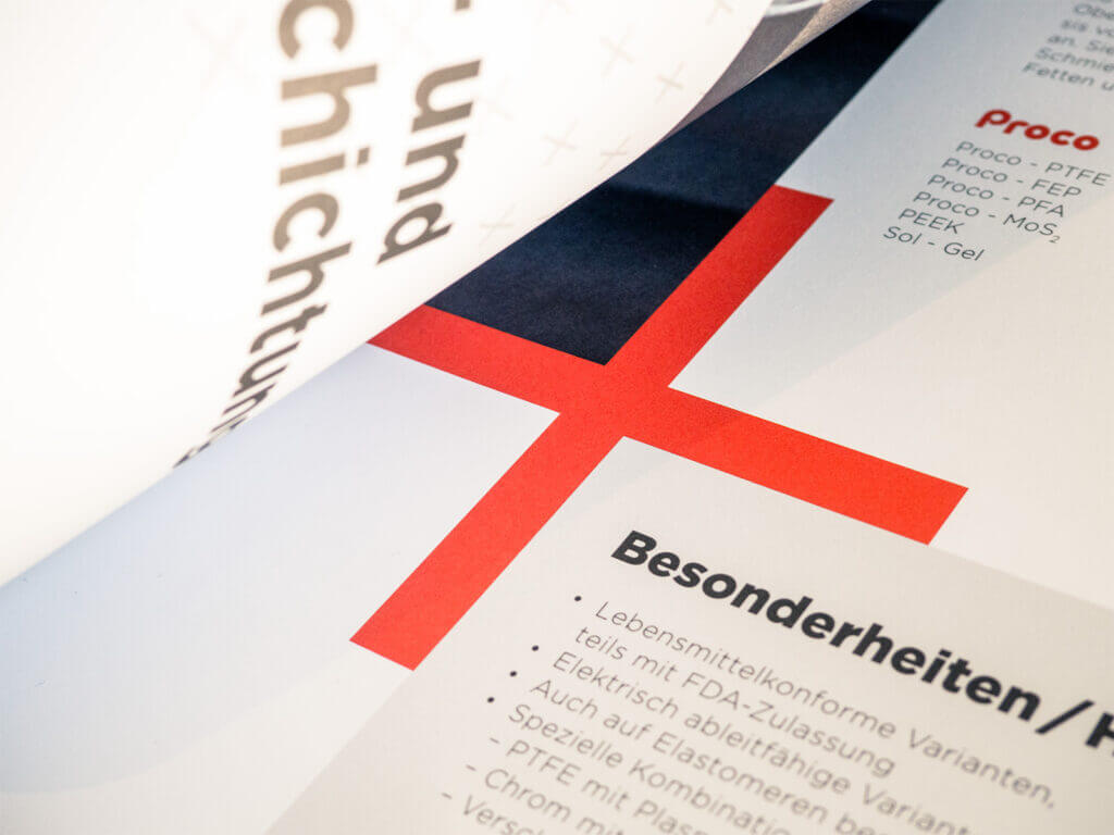 Hierbei wurde auch das Erscheinungsbild mit Hilfe einer neuen Typografie-Systematik auf Stand gebracht. Im Rahmen des Transformationsprozesses wurde mit dem „+“ aus dem Firmenlogo ein Gestaltungselement entwickelt, welches zur klaren Strukturierung von Inhalten beitragt. Inszeniert als Gitternetz symbolisieren die Pluszeichen eine beschichtete Oberfläche und stehen mit ihrer schwungvollen Darstellung stellvertretend für die innovative Energie des Unternehmens.