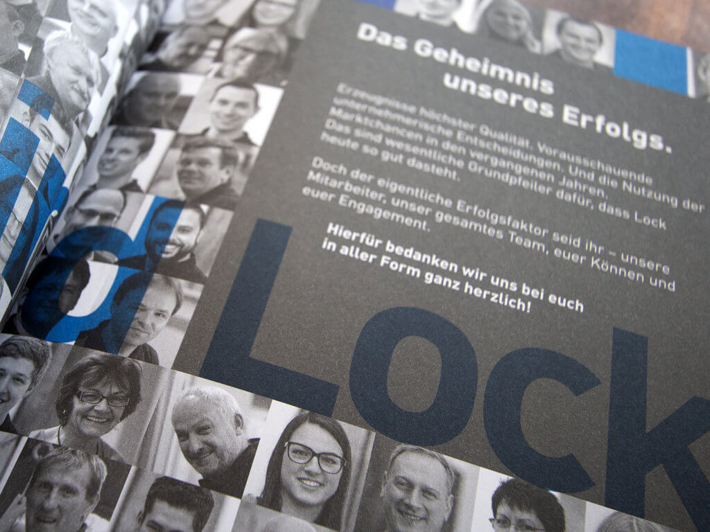 Grafisch reduziert-modern gehalten zieht das Booklet mit seinen auf der Basis eines Fotobriefings realisierten, emotionalen Bildwelten den Betrachter in seinen Bann. Es kommuniziert den Lock-Wertekodex, die Zukunftsstrategie sowie den Markenkern in puristischer Form – und dennoch vielsagend. Auf diese Weise gelingt es, die Mitarbeiter in sehr persönlicher, ansprechender Form zu begeistern sowie zu motivieren und letztlich mit auf die gemeinsame Reise in eine vielversprechende Zukunft zu nehmen.