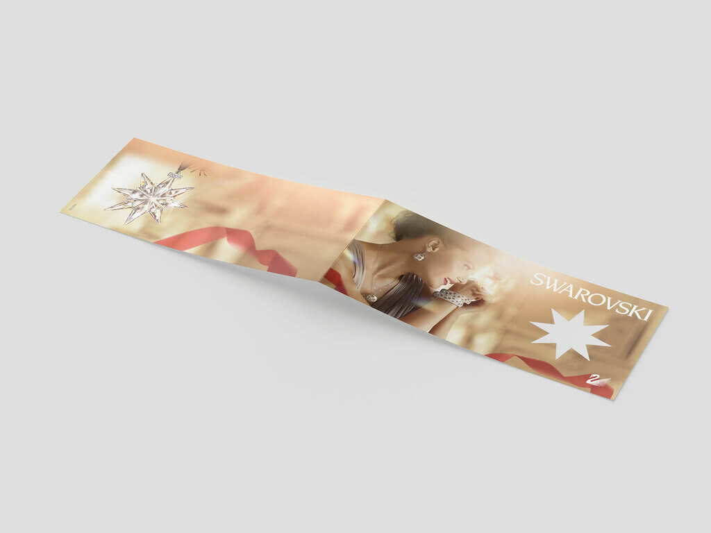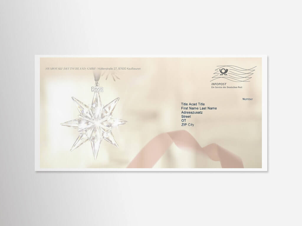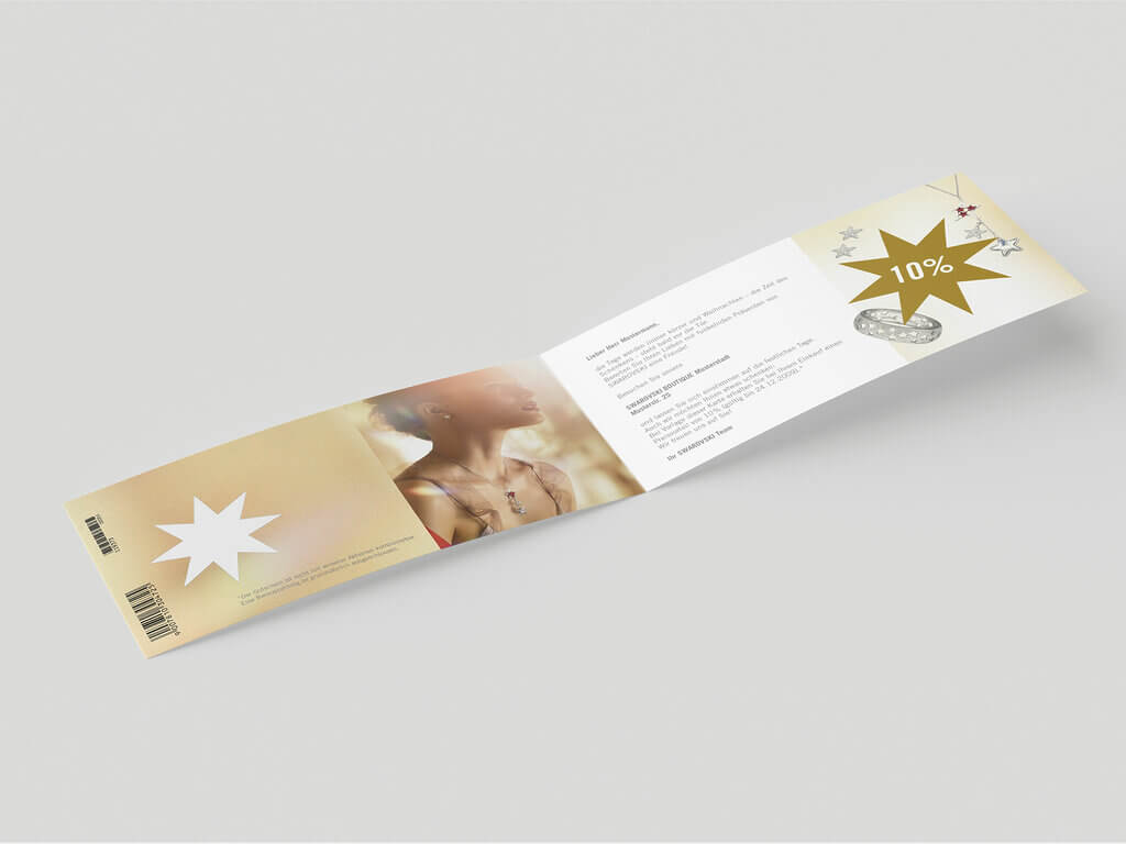 Das vorliegende Mailing besteht aus einem 4-seitigen Folder im DIN lang quer-Format, das in einer Auflage von 33.000 Stück gedruckt wurde. Sowohl das Kuvert als auch der Folder sind personalisiert, um eine individuelle Ansprache zu ermöglichen. Der Druck erfolgte in 4/4-farbigem Druck. Ein besonderes Highlight ist die sternförmige Stanzung auf der Vorderseite, die dem Mailing eine zusätzliche räumliche Tiefe verleiht. Im Inneren des Folders befindet sich ein Stern mit Heißfolienprägung in Gold, der durch die Stanzung auf der Vorderseite hindurchscheint und somit einen Blickfang darstellt. Das Kuvert ist transparent und unterstreicht die hochwertige Optik des Mailings.